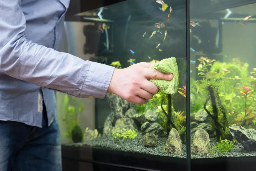پاکسازی شیشه بیرونی آکواریوم با اسپری گلس کلیر