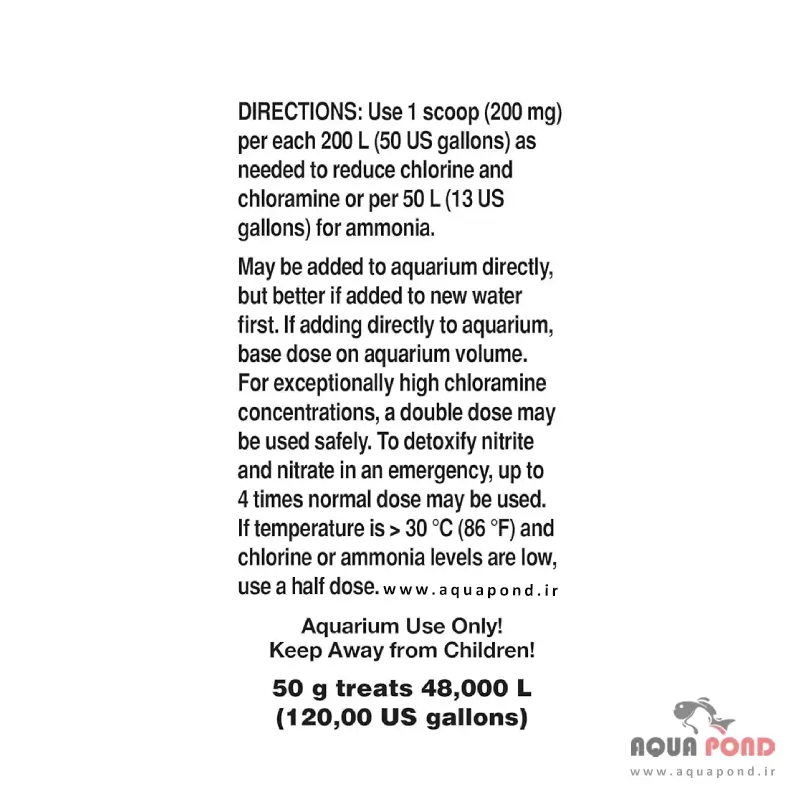برای حذف کلر و کلرامین : ۲۰۰ میلیگرم Safe (یک پیمانه) بهازای ۲۰۰ لیتر (۵۰ گالن) آب