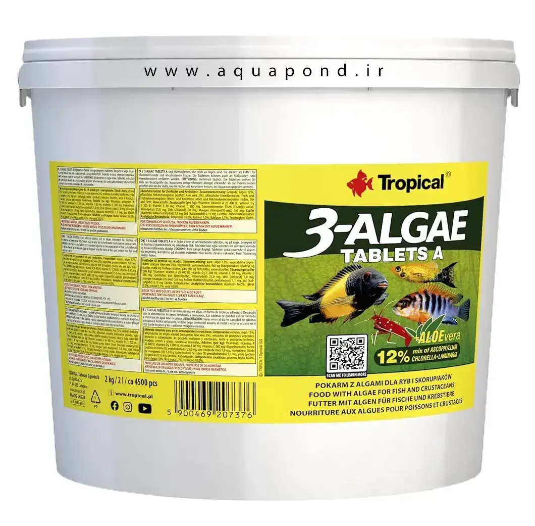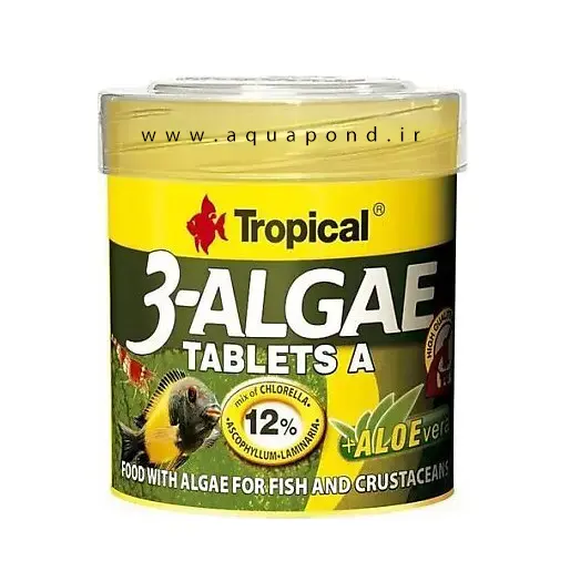 تروپیکال قرص ۳ جلبک + آلوئه ورا (3ALGAE tablet A ) برای تغذیه روزانه ماهی های گیاهخوار آب شیرین و آبشور که رژیم غذایی آنها بر اساس جلبک است و ماهی همه چیزخوار به عنوان غذای مکمل در نظر گرفته شده است.