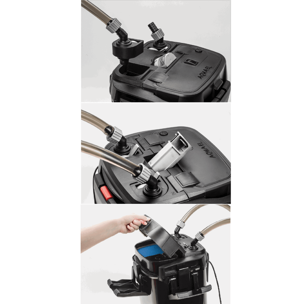 فیلتر Aquael Ultramax 1500 با حجم بالای مدیاهای فیلتراسیون خود شناخته میشود و به لطف فناوریهای ثبتشده مانند پیشفیلتر داخلی (Prefilter)، سیستم شیر دوبل (Double Ball Valve System) و سیستم خودمکش (Self-Priming System)، هم راحتی کاربر و هم عملکرد بالا در فیلتراسیون را تضمین میکند.