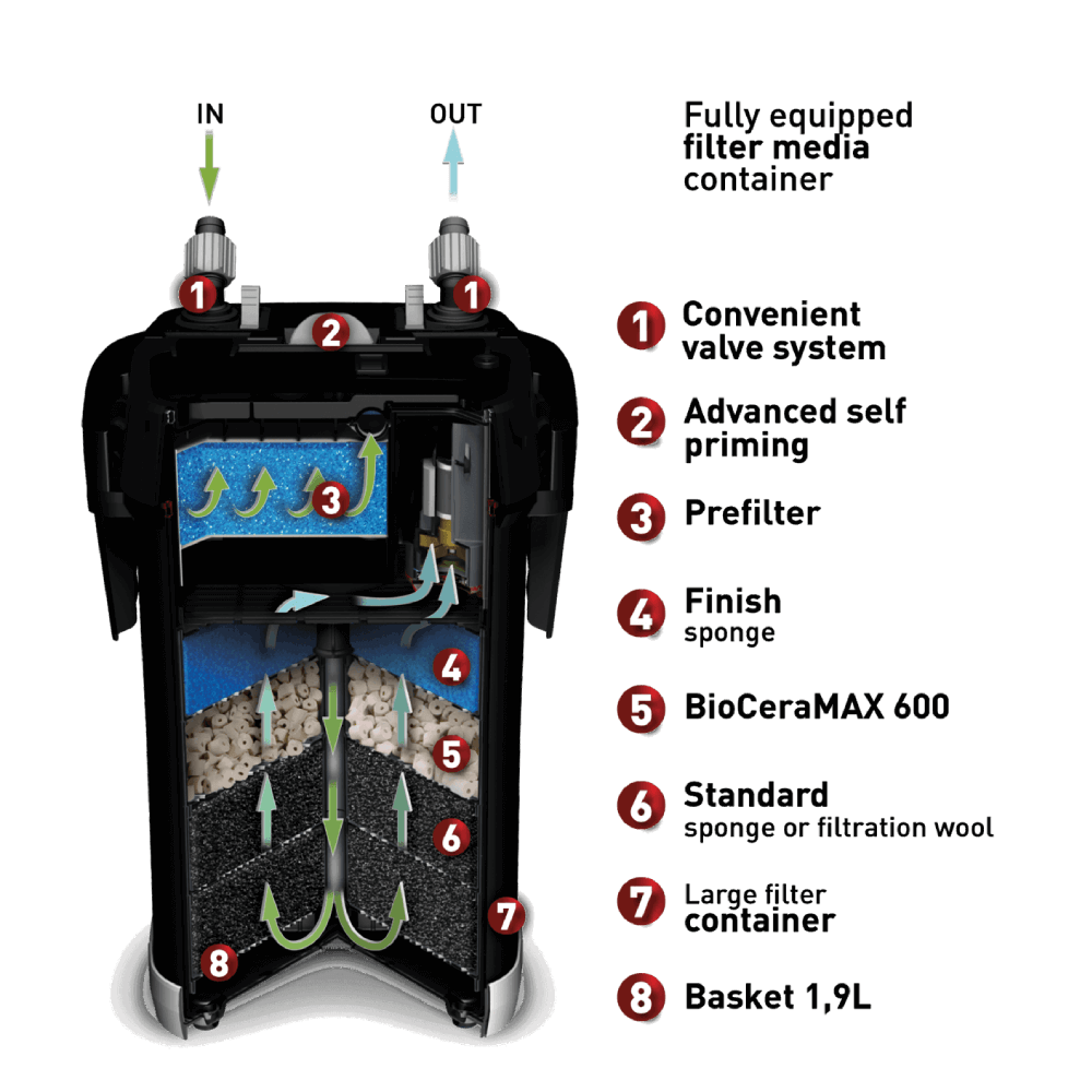 فیلتر Aquael Ultramax 1500 با دارا بودن حجم بالای مدیای ۸.۲ لیتر و بهکارگیری فناوریهای ثبتشده مانند پیشفیلتر داخلی، سیستم شیر توپی دوتایی برای کنترل جریان آب و مکانیزم راهاندازی خودکار هواگیری ، نهتنها کارایی فیلتراسیون را افزایش میدهد بلکه نگهداری و سرویس دستگاه را برای کاربر بسیار راحت میکند.