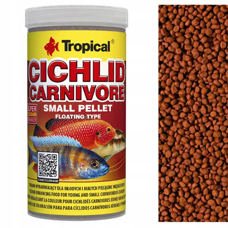 تروپیکال سیچلاید کارنیور گرانول سایز متوسط مخصوص سیچلایدهای گوشتخوار، غذایی غنی از پروتئین حاوی آستاگزانتین برای سیچلایدهای گوشتخوار بزرگ و متوسط، مانند: فرانتوزا، چاناها، اسکار، ماهیان مانستر مصل پیکاک، آروانا و…