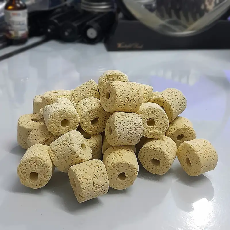 مدیا بایو سرامیک MS-1 ماهیران که دارای شکل حلقوی با منافذ ریز روی سطح برای سطح کشت بالاتر باکتری های مفید است، برای قرارگیری در انواع فیلتراسیون سطلی، تاپ فیلتر، سامپ و…مناسب است