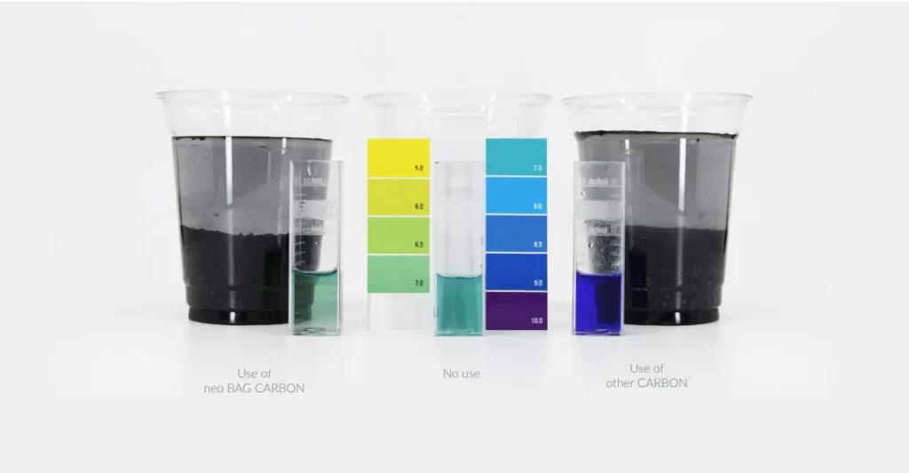 کربن فعال عمدتاً در فرآیند تولید، هیدروکسید زیادی تولید می کند که باعث افزایش pH آب می شود، اما کربن نئو کیسه روی pH تأثیر نمی گذارد