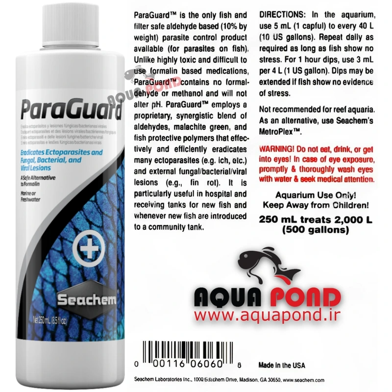 برخلاف بسیاری از داروهای مشابه، ParaGuard فاقد فرمالدئید و متانول است و بر pH آب تأثیر منفی ندارد. فرمولاسیون منحصربهفرد آن موجب میشود استفادهی روزانه از آن در تانک قرنطینه یا هنگام ورود ماهیهای جدید به آکواریوم، ایمن و مؤثر باشد.