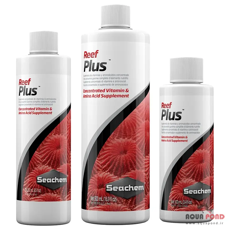 برخلاف مکملهای ویتامینی دیگر که ناقص بوده و فقط حاوی ویتامینها و مواد معدنی کمیاب هستند، Reef Plus علاوه بر اینها شامل اسیدهای آمینه ضروری نیز میباشد و همچنین مقدار زیادی ویتامین C و ویتامینهای گروه B دارد. این محصول آنقدر غلیظ است که حتی میتوان از آن بهعنوان محلول خیساندن غذای یخزده ماهیها استفاده کرد.