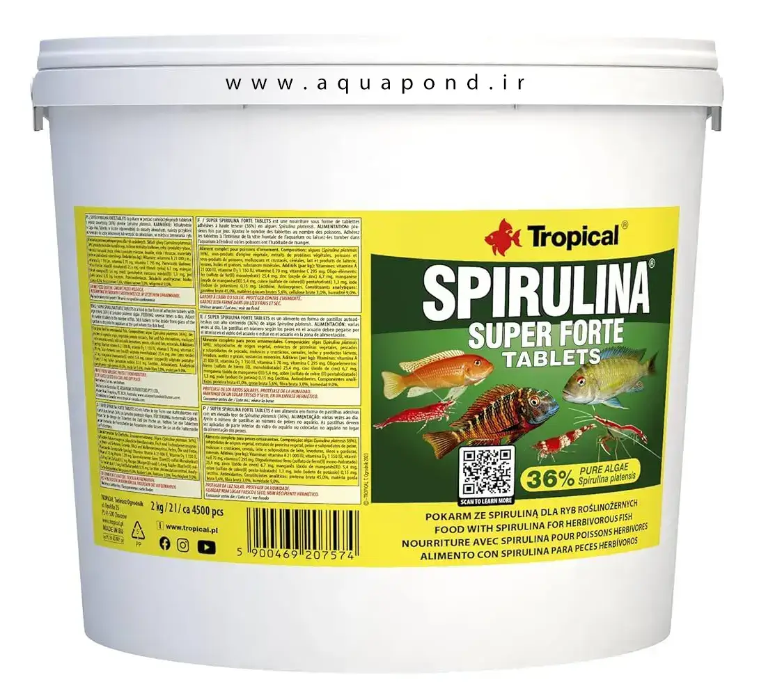 قرص اسپیرولینا ۳۶% سوپرفورت تروپیکال غذای گیاهی به شکل قرص با محتوای بالای (۳۶%) جلبک اسپیرولینا پلاتنسیس برای سیچلایدهای آفریقایی که از جلبک تغذیه میکنند و سایر ماهیها، از جمله ماهیهای دریایی که رژیم غذایی آنها به مقدار قابل توجهی مواد گیاهی نیاز دارد.