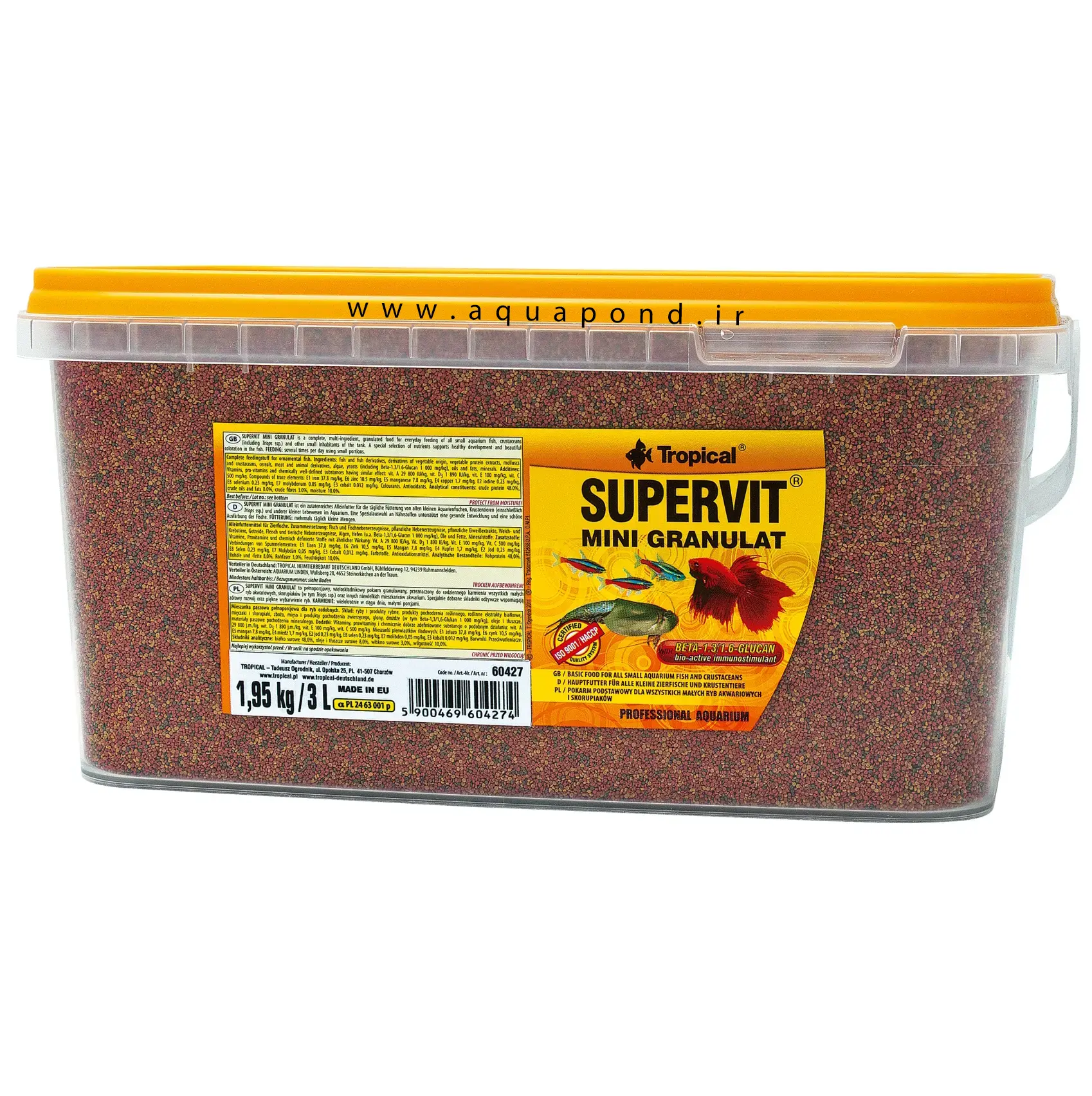 تروپیکال سوپرویت مینی گرانول (supervit mini granulat) غذایی چند جزئی به شکل گرانولهای کوچک و با جذب آهسته است که برای تغذیه روزانه گونههای کوچک ماهیهای همهچیزخوار و گوشتخوار مناسب است. همچنین به عنوان غذا برای حلزونها و سختپوستان، از جمله حلزونماهی، نیز مفید است. فرمول بسیار غنی و متنوع آن، تمام مواد مغذی لازم را برای ماهی فراهم میکند. افزودن بتاگلوکان، سیستم ایمنی ماهیها را تقویت میکند. این غذای ماهی پایه، انتخابی ایدهآل برای آکواریومهای چند گونهای است. قوطی ۱۰۰میل/ ۶۵گرم و ساشه ۱۰گرمی