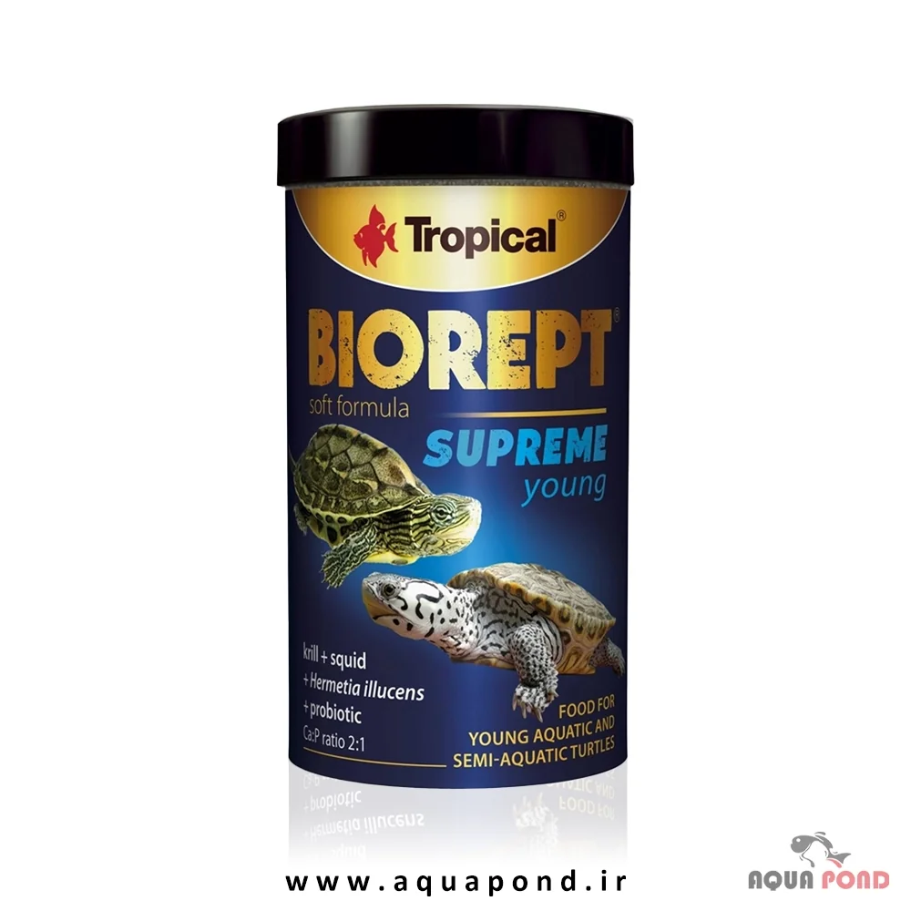 تروپیکال بایورپت سوپرم یانگ (Tropical biorept supreme young) غذای کامل و پایه برای لاکپشتهای جوان آبزی و نیمهآبزی است که شبیه غذاهایی است که لاکپشتها در طبیعت میخورند، همچنین این غذا را میتوان به ماهی های بزرگ شکارچی داد
