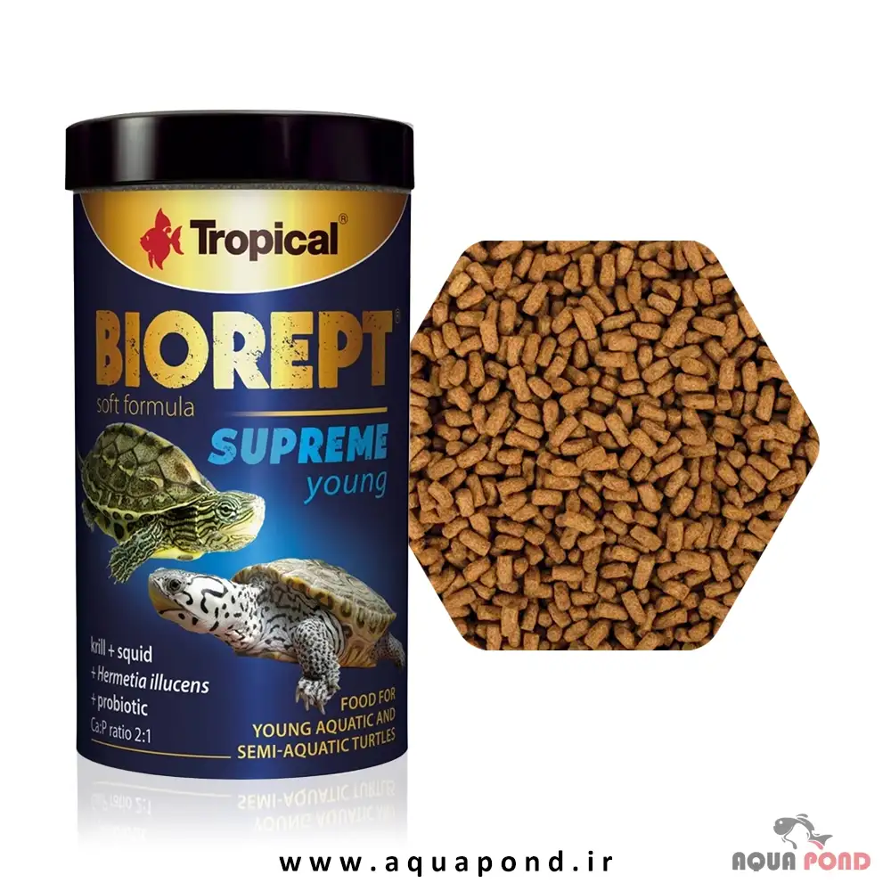 بایورپت سوپرم یانگ تروپیکال (Tropical biorept supreme young) غذای کامل و پایه برای لاکپشتهای جوان آبزی و نیمهآبزی است که شبیه غذاهایی است که لاکپشتها در طبیعت میخورند، همچنین این غذا را میتوان به ماهی های بزرگ شکارچی داد
