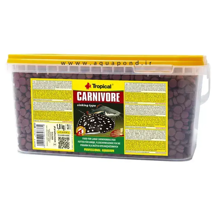 تروپیکال کارنیور یک ماده غذایی جدید از سری غذاهای Tropical برای دوستداران ماهی های گوشتخوار است. محتوای پروتئین بالا که به راحتی جذب می شود، نیازهای غذایی گربه ماهی ها، پوتامتریگونیده ها (سفره ماهی های آبشیرین)، سر مارها و سیچلاید های بزرگ مثل فرانتوزا، اسکار، چانا ها و…را پوشش می دهد.