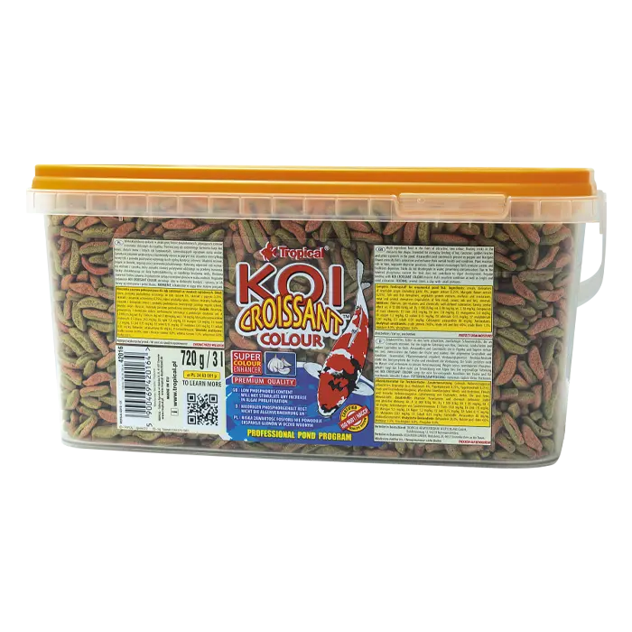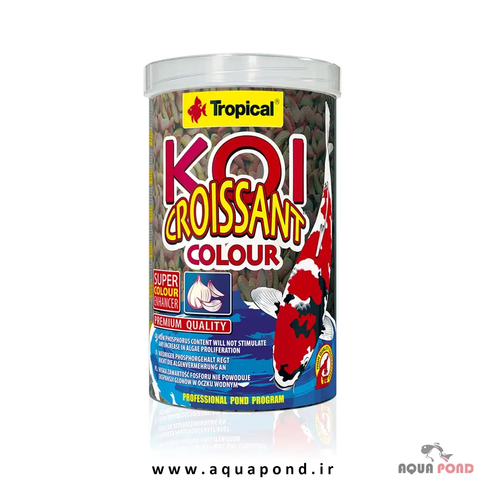 تروپیکال کوی کروسان کالر (Tropical koi crossant colour) غذای استیکی دو رنگ با سیر، مخصوص کوی، به شکل کروسانهای کوچک. برای تغذیه روزانه کوی و سایر کپورماهیان برکهای در نظر گرفته شده است و سلامت سیستم گوارش، تشدید و تقویت رنگ را تضمین میکند
