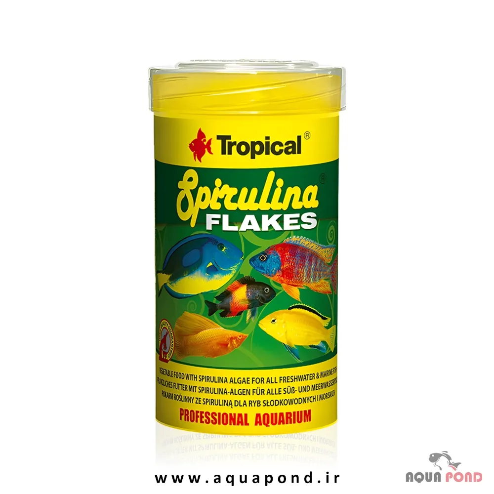 پولکی اسپیرولینا تروپیکال یک غذای گیاهی پولکی با جلبک اسپیرولینا پلاتنسیس (۶%) برای تغذیه روزانه ماهیان گیاهخوار و همه چیزخوار در آکواریوم های آب شیرین و دریایی، از جمله سیچلایدهای محبوب مالاوی امبونا، گوپی، مولی و سایر ماهیان زنده زا.