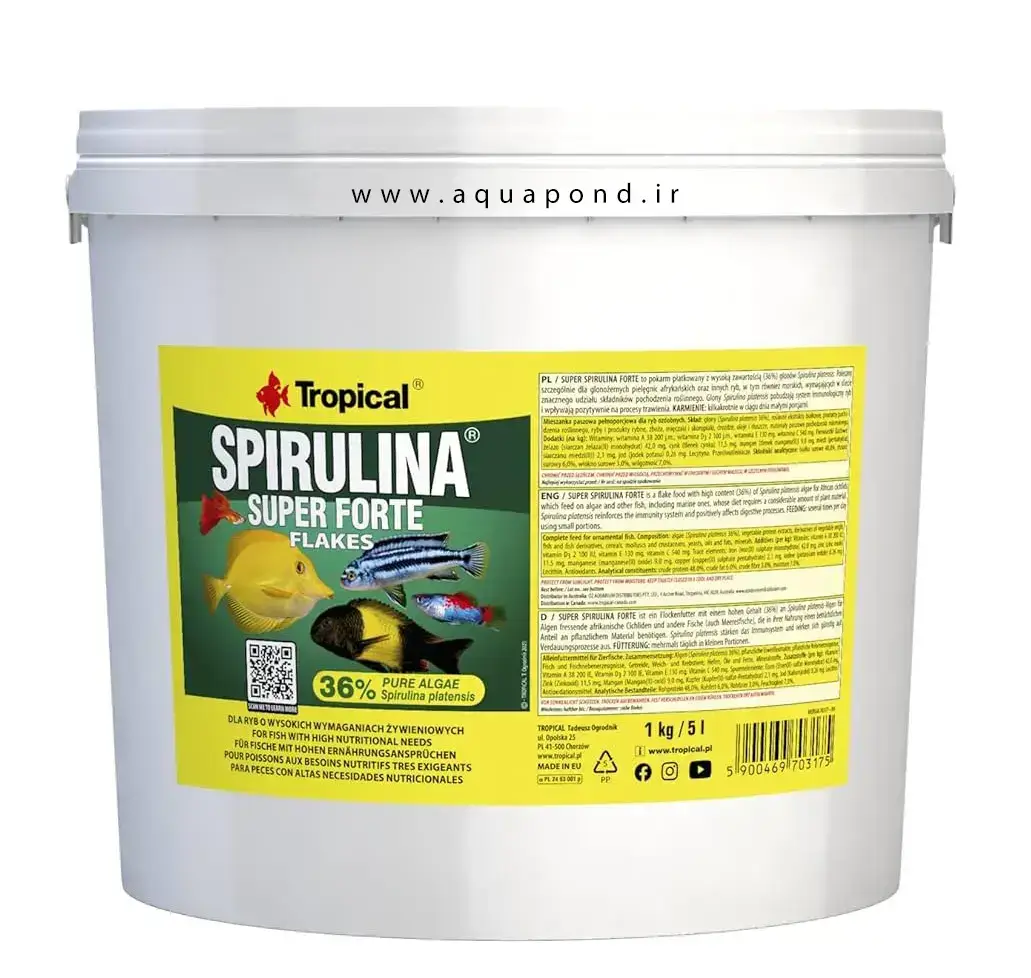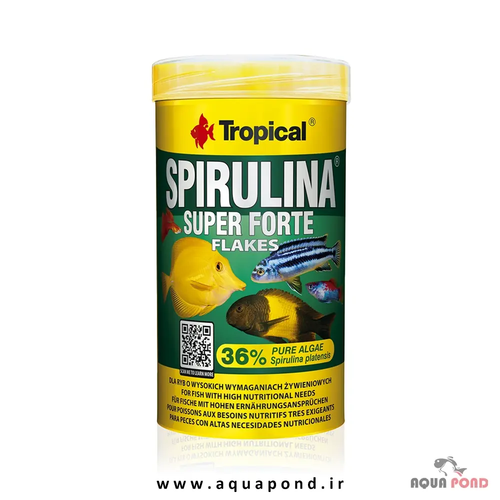 پولکی اسپیرولینا ۳۶% سوپرفورت تروپیکال(Tropical spirulina super forte 36% flake) یک غذای حرفه ای مخصوص گیاه خواران آبشیرین و آبشور است که حاوی مقدار زیادی جلبک اسپیرولینا میباشد. این ماده که اخیراً برای غذای ماهیان زینتی مدرن کشف شده است، به طور طبیعی ارزش غذایی را بهبود میبخشد و تغذیه بهینه را تضمین میکند.