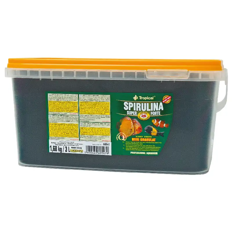 مینی گرانول اسپیرولینا ۳۶% سوپر فورت تروپیکال غذای کامل ماهی های زینتی. ترکیبات: جلبک (از جمله Spirulina platensis حداقل ۳۶%)، عصاره پروتئین گیاهی، مشتقات با منشاء گیاهی، ماهی و مشتقات ماهی، غلات، نرم تنان و سخت پوستان، مخمرها، روغن ها و چربی ها، مواد معدنی (شامل زئولیت ۱%). افزودنی ها (به ازای هر کیلوگرم): ویتامین ها، پروویتامین ها و مواد شیمیایی کاملاً مشخص با اثرات مشابه: ویتامین. در ۳۸۰۰۰ IU، vit. D3 2000 IU, vit. E 200 میلی گرم، ویتامین. C 540 میلی گرم. ترکیبات عناصر کمیاب: E1 (Fe) 42.0 میلی گرم، E6 (Zn) 11.5 میلی گرم، E5 (Mn) 9.0 میلی گرم، E4 (Cu) 2.1 میلی گرم، E2 (I) 0.26 میلی گرم، E8 (Se) 0.26 میلی گرم، E7 (Mo) 0.06 میلی گرم. رنگ ها. آنتی اکسیدان ها ترکیبات تحلیلی: پروتئین خام ۴۸.۰ درصد، چربی خام ۶.۰ درصد، فیبر خام خام ۳.۸ درصد، رطوبت ۱۰.۰ درصد.