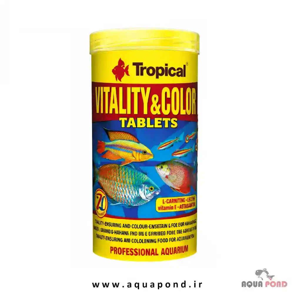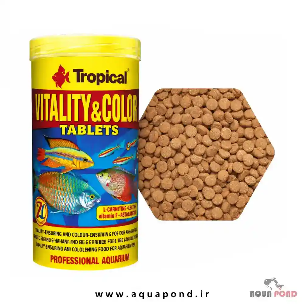 قرص ویتالیتی و کالر تروپیکال یک غذای کامل و تقویتی است که علاوه بر تأمین نیازهای تغذیهای ماهیان، به افزایش انرژی و درخشندگی رنگ آنها کمک میکند. این محصول با دارا بودن رنگدانههای طبیعی و ترکیبات تقویتکننده، باعث برجستهتر شدن رنگهای قرمز، نارنجی و سایر رنگهای گرم در ماهیان زینتی میشود. ساختار تبلتی آن باعث میشود غذا بهآرامی در آب حل شده و امکان تغذیه طبیعی برای ماهیانی که از سطوح یا کف آکواریوم تغذیه میکنند فراهم شود.